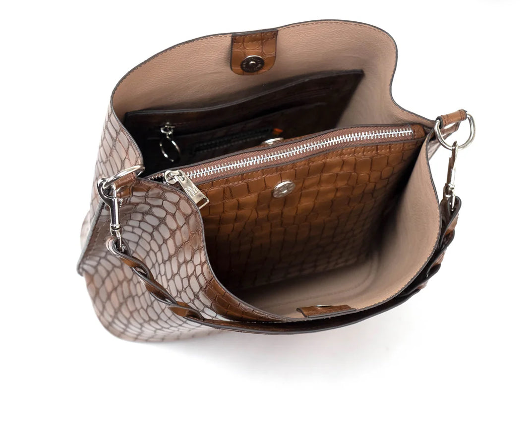 Nuestro Bucket Suría tiene el espacios muy bien distribuidos. Esta dividido por un bolso interior que se cierra con cremallera y puede guardar las cosas que necesites con mayor seguridad. Aparte tiene dos epacios abiertos, donde podras guardar las cosas que necesites de facil acceso una de ellas con un bolsillo con espacios divididos. Cuanta con dos asas, una corta hecha con cadena metalica y una larga con cinta que es bastante suave para tus hombros.